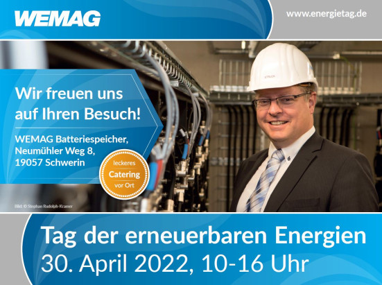 Jedes Jahr beteiligt sich die WEMAG mit ihrem Batteriespeicher in Schwerin-Lankow erneut am Aktionstag. In Mecklenburg-Vorpommern findet am letzten Wochenende im April sogar ein ganzes Aktionswochenende zum Tag der Erneuerbaren Energien statt. Vom 29. April bis 1. Mai 2022 kann man im ganzen Bundesland viele Angebote wahrnehmen und das Energiewendeland M-V entdecken. Gleichzeitig bietet der Tag ein Forum zum Austausch für Fragen rund um den Klimaschutz. Die Initiative für einen solchen Aktionstag entstand anlässlich des Jahrestages der Reaktorkatastrophe in Tschernobyl 1986, um sich gemeinsam auf nachhaltige Alternativen der Energieproduktion zu fokussieren.