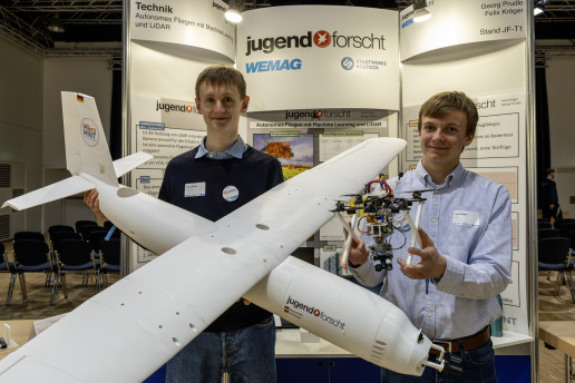 Den 1. Preis im Fachgebiet Technik bekamen Georg Prudlo und Felix Kröger vom Innerstädtischen Gymnasium Rostock. Sie haben sich vorgenommen, ein autonom fliegendes Modellflugzeug zu entwickeln und zu bauen. Für die Umgebungserfassung und Hinderniserkennung verwenden sie spezielle Sensoren und ein kamerabasiertes Objekterkennungssystem. Für die Datenverarbeitung und Steuerung wird ein Flugcontroller sowie ein Raspberry Pi eingesetzt. Das Flugzeug wurde im CAD-Programm konstruiert und mit 3D-Druckern gefertigt.