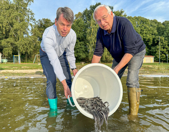 Der Landesanglerverband Mecklenburg-Vorpommern e.V. (LAV MV) und der Energieversorger WEMAG haben erneut gemeinsam junge Aale in Mecklenburger Seen eingesetzt. Dazu trafen sich Axel Pipping, Geschäftsführer des LAV MV mit WEMAG-Vorstand Capar Baumgart am Goldberger See. Dort entließen sie etwa die Hälfte von insgesamt rund 100 Kilogramm vorgestreckter Jungaale im Wert von 5.000 Euro in das Gewässer. Die übrigen Tiere wurden anschließend im Neuhofer See eingesetzt. Die etwa 10.000 kleinen Aale wiegen jeweils etwa 10 Gramm und sind 15 bis 20 Zentimeter lang. Jetzt bewohnen die Jungaale vor allem die Schilfgebiete im Uferbereich.