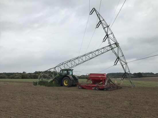 Bei Feldarbeiten wurde ein Freileitungsmast der WEMAG Netz GmbH durch einen Traktor beschädigt. Foto: WEMAG/Rupp