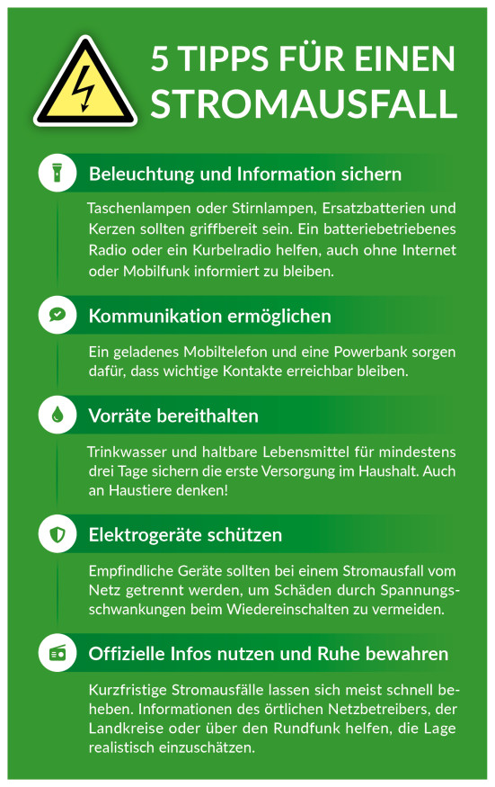 Ruhe bewahren und offizielle Informationen nutzen: Kurzfristige Stromausfälle lassen sich meist schnell beheben. Informationen des örtlichen Netzbetreibers, der Landkreise oder über den Rundfunk helfen, die Lage realistisch einzuschätzen.