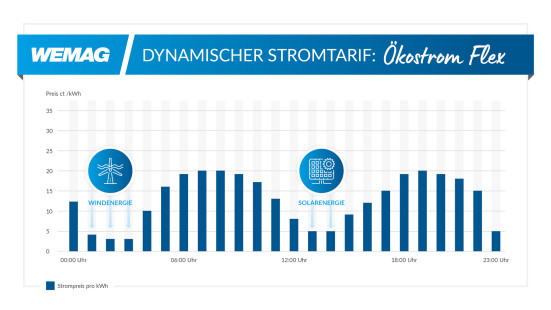 Eine Alternative mit Sparpotenzial im Homeoffice sind dynamische Stromtarife wie unser WEMAG Ökostrom Flex. Bei diesem zahlen Sie keinen festen Preis. Die Kosten für eine kWh variieren nach Angebot und Nachfrage. Ausgerichtet am aktuellen Einkaufspreis der Energie an der Strombörse, zahlen Sie weniger, wenn durch Sonnenenergie und Windkraft viel Strom produziert wird. Beispielsweise in den Mittagsstunden eines schönen Sommertages. Verbrauchen Sie Strom zu dieser Zeit, können Sie die Kosten merklich senken. Dafür benötigen Sie lediglich einen Smart Meter. Dieser misst in kurzen Intervallen den Verbrauch, damit Sie von dynamischen Preisen zu bestimmten Tageszeiten profitieren.